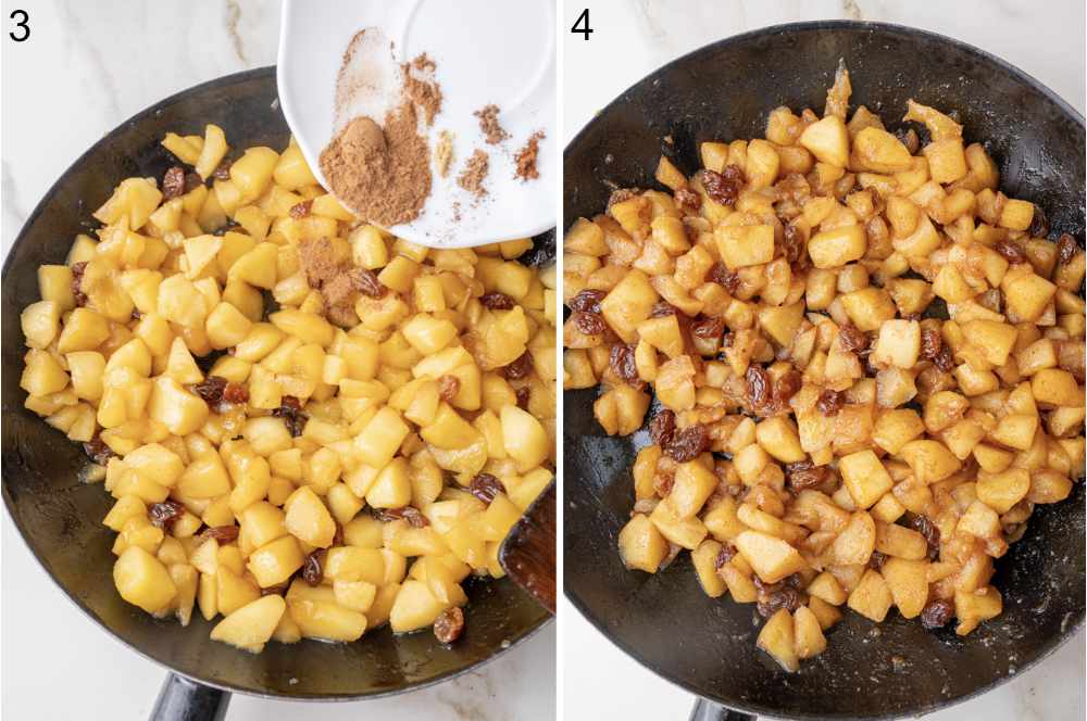 STEP 2: Heat the butter in a medium/large pan over medium-high heat, then add the apples. Don’t stir for the first 2–3 minutes — let the apples brown on the bottom. Then stir in the sugar and raisins. Cook for 5–10 minutes, or until the apples are soft but not falling apart. The cooking time will depend on the apple variety — whether they’re firm, soft, or watery. The filling should not be watery. If your apples are too dry, add a splash of water to stew them.