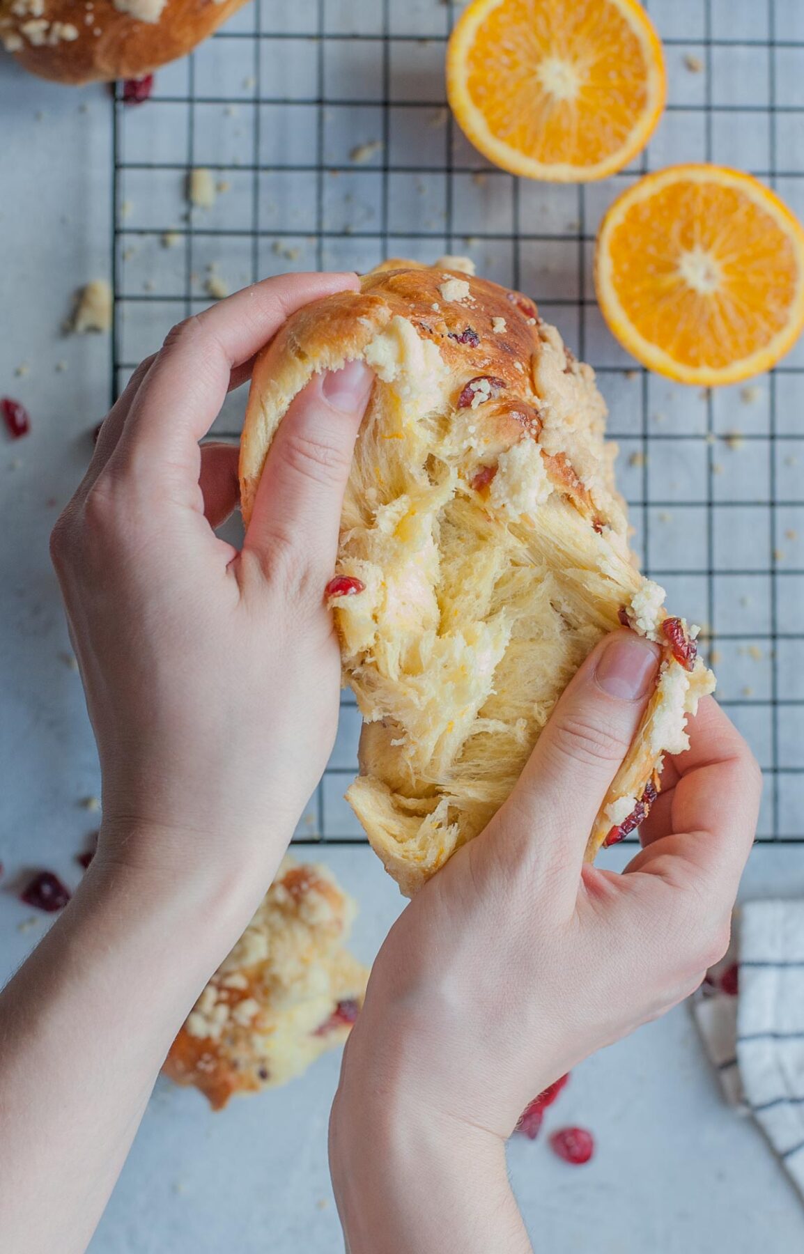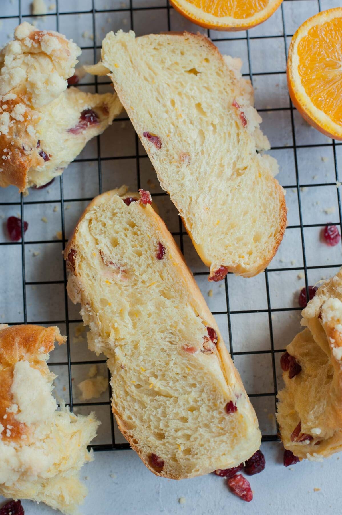 Delicious buttery brioche with dried cranberries, flavored with orange zest, and topped with crunchy crumble. This braided brioche is super easy to make (given that you have a stand mixer), but requires a little patience – the dough has to rest overnight in the fridge to develop great flavor and texture. It‘s definitely worth it – you’ll be rewarded with a wonderfully smelling, fluffy, and buttery bread!