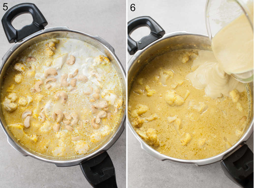 - Add the coconut milk, broth, and cashew nuts, bring to a boil.