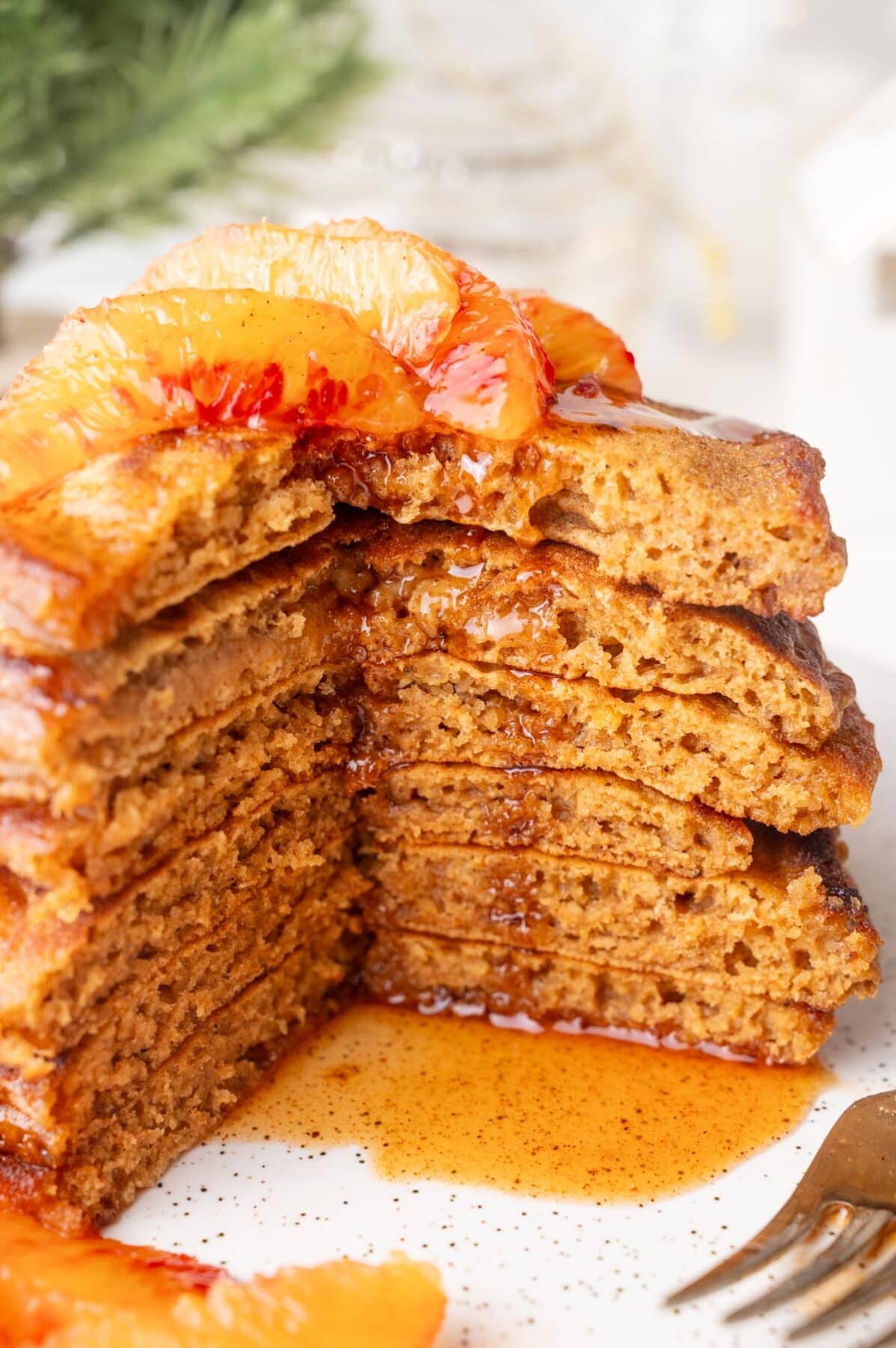 Optional: make orange gingerbread syrup: Add orange juice to a medium saucepan. Cook over high heat for a couple of minutes or until reduced about in half or 2/3 in volume. Add maple syrup and gingerbread spice mix. Cook, whisking, for about a minute. The syrup will be a little bit too runny at this point but it will achieve the right consistency once cooled down. Pour the syrup over the pancakes.