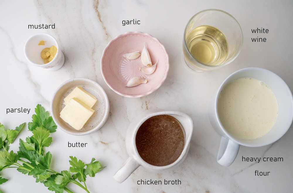 - Add the broth, cream, and Dijon mustard. Bring the sauce to a boil and whisk until all the ingredients are well combined.1 cup (240ml) heavy cream, 1 cup (240ml) chicken broth, 1 teaspoon Dijon mustard