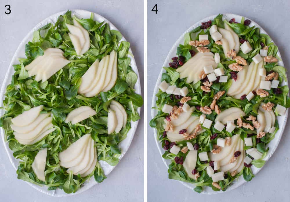 - Peel the pear (you can also leave the skin on if you’d like), cut into 4 parts, cut out the core, then cut each part into thin slices. Arrange the pear slices on top of the salad greens.