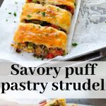 A delicious puff pastry strudel filled with cheese and vegetables. It’s a perfect party snack or just an afternoon snack. This savory strudel can be served with a dipping sauce (although it’s so good on its own) or with a salad.