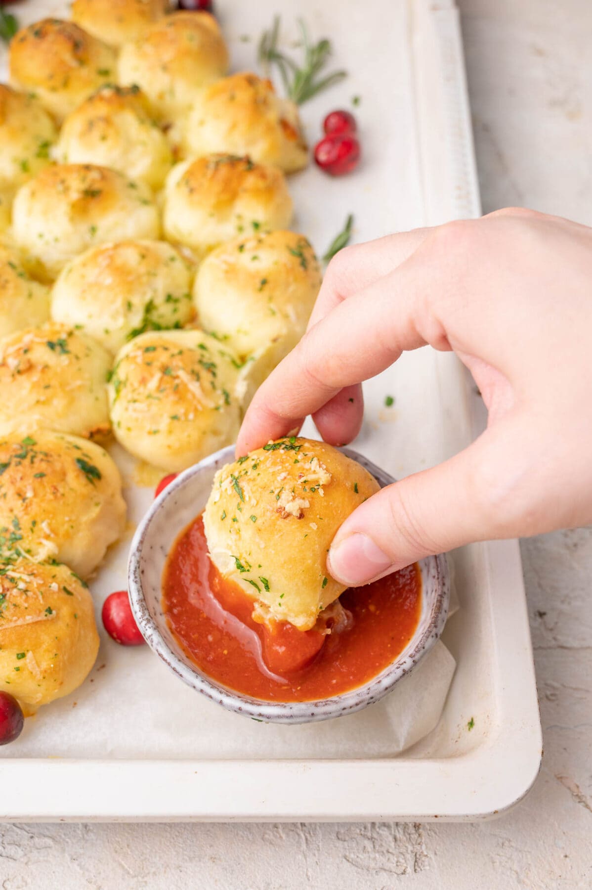 This pull-apart Christmas tree is an easy and delicious appetizer made from pizza dough and cheese. Dip these garlicky pizza bites in your favorite dipping sauce!